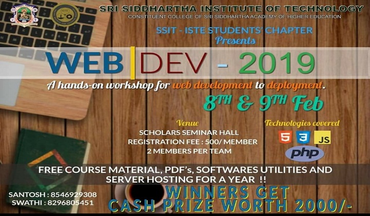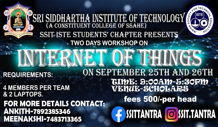 SSIT-ISTE Students' Chapter being established during the year 1991 with the motto "TRAINING IS EVERYTHING, WE CAN GET EXTRAORDINARY RESULTS OUT OF ORDINARY PEOPLE BY TRAINING AND TRAINING" is actively functioning by organizing events like: guest lectures by experts, technical workshops and trainings that help students to update their knowledge about the new technologies. ISTE Students' Chapter of the institution is organizing a National Level Technical Symposium - TANTRA. It was initiated by our beloved Organizing Director Dr.K.B.Shiva Kumar, Professor and Head, Dept. of Telecommunication Engineering, SSIT, Tumkuru and now our team being guided by our Faculty Advisor Dr.Batluri Tilak Chandra, Asst.Professor, Dept. of Mechanical Engineering, SSIT, Tumakuru is doing great. The main phase of ISTE Students' Chapter in SSIT started Technical Fest TANTRA in the year 2008.Our Students' Chapter received certificate of appreciation as best ISTE Students' Chapter of Karnataka State during the year 1999-2000 and 2008-2009.